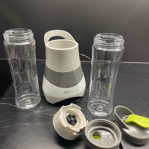 Kaapissa pölyttynyt blenderi. Mukana 2 isompaa ja 1 pienempi pullo.