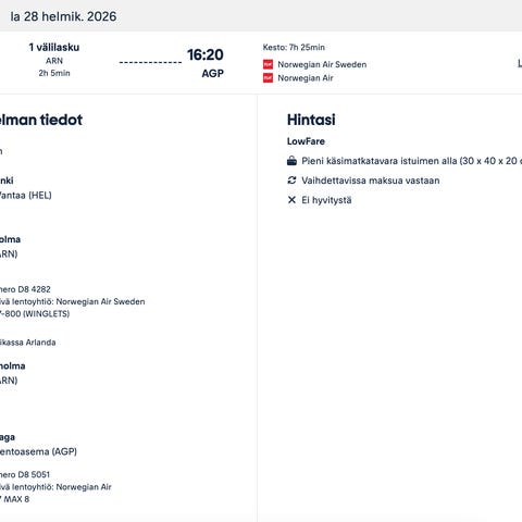 Myydään Helsinki - Malaga lennot Norwegianilla yhdelle henkilölle Lowfare -lipputyypillä. Lähto 26.4. klo 6.35 Helsinki -paluu 4.5. klo 20.05 Malaga. Ostohinta 270€. Nimenvaihto 65€. Eli voisin myydä lipun hintaan 150€, jolloin ostaja maksaa nimenvaihdon eli kokonaishinta meno-paluu -lipulle 215€. Tarjoa,