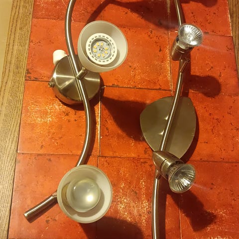 Kaksi valaisinta on siistejä, mutta yhdessä on kolmessa kohdin lommoja. Näistä kohdista on kuvat erikseen. Kuvassa ovat vielä pölystä pyyhkimättä. 😆