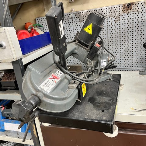 Metallityökalu kylmäsaha, jossa on teräsrunko ja pyörivä leikkuuterä. Käytetään metallin leikkaamiseen. Laite on sähköllä toimiva ja soveltuu teolliseen tai harrastuskäyttöön. Hyvässä kunnossa oleva terä.
