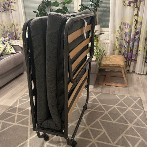 Kuvanmukainen, perussiisti taitettava "vierassänky". Viime vuodet varastossa. Pohjassa renkaat joilla siirrettävissä kun on taitettu kasaan. Patjan saa mukaan jos haluaa. Noutohinta.