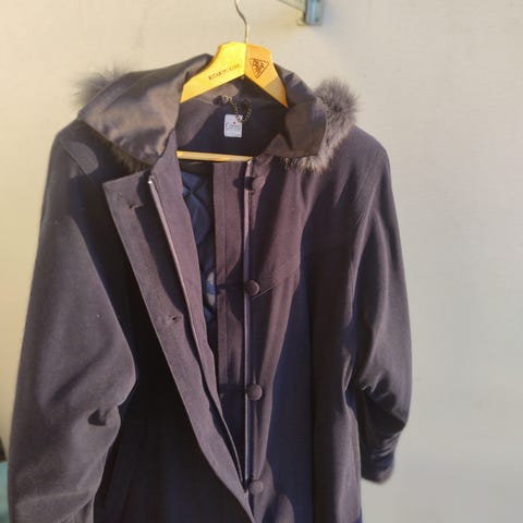 Kivoja yksityiskohtia, esim. alaosa tikatty vinottain ja yläosavaakasuoraan. Vetoketju kaksisuuntainen ja vetoketjut myös sivuilla. Pituus olalta 80vm ja leveys kai-kai 50cm.