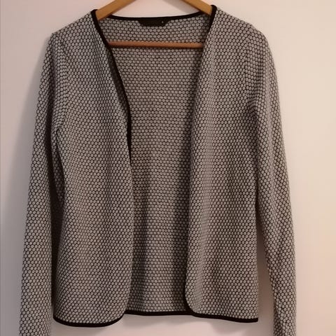 Kuvan setti : ohutta neulosta oleva tunika ( nyppiä on), Nabo pikku laukku ( kulumaa kulmissa) ja koru.