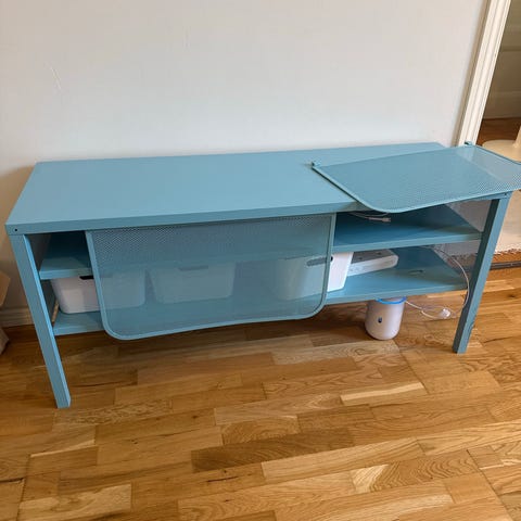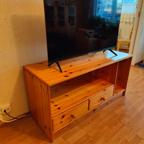 Tv-taso, jossa hyvin säilytystilaa kaappien takana. Oikea kaapinovi jotenkin vähän löysällä, mutta toimii kyllä.