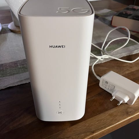 Huawei 5G Mobile WiFi reititin tarjoaa langattoman verkkoyhteyden 5G-verkoissa. Laitteen koko ja väri näkyvät kuvissa, ja se on suunniteltu mobiilikäyttöön.
