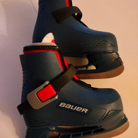 Myydään hyväkuntoiset Bauerin ensiluistimet, siniset. Koko 25/26, mutta aavistuksen naftia kokoa.