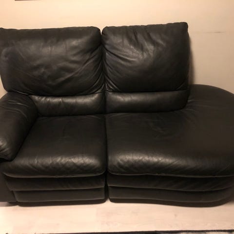 Tässä olisi kolmen istuttava keinonahkainen Ikean Skogaby- sohva. Sohva pidetty siistinä ja se ei paljoa uudelle häpeä. Ainoa kosmeettinen haitta on toisessa etukulmassa jalan vieressä oleva nirhauma, joka on aiheutunut sohvan kantamisesta portaikossa.