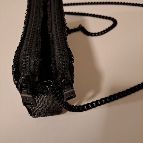 Leveys enimmillään noin 53 cm. Korkeus enimmillään noin 35 cm. Syvyys enimmillään noin 19 cm. Yläreunassa vetoketju. Vuorikankaassa Steve Madden - logoja.