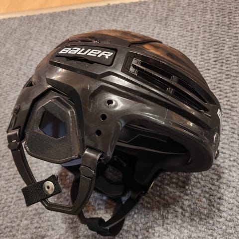 Valkoinen Bauer kypärä jossa Kohon suojaristikko. En löydä kokomerkintää, menee myös aikuiselle jos on pieni pää eikä ole lakkia päässä. Joku S tämä varmaan on. Nouto Oulunsalosta