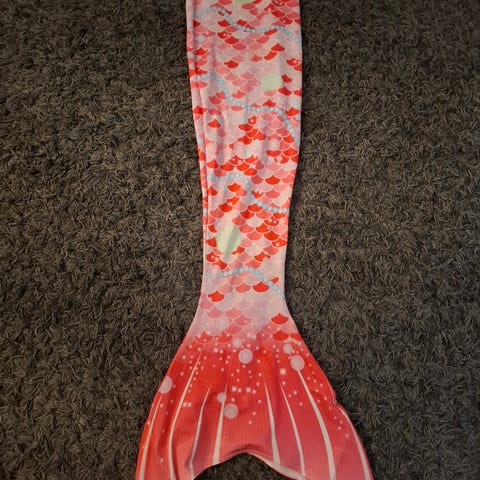 Kaupan päälle saa merenneidon pyrstön, koko 6. Pyrstö on huonokuntoinen: kangas on venynyt ja sitä on paikattu useita kertoja, mutta sitä voi vielä käyttää.
