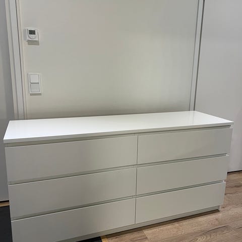 Valkoinen, Ikean Malm lipasto. 6 laatikkoa. Oikean puoleisen alalaatikon pohja huonosti kiinnitetty (suljettaessa toisinaan jumittaa), muuten virheetön.