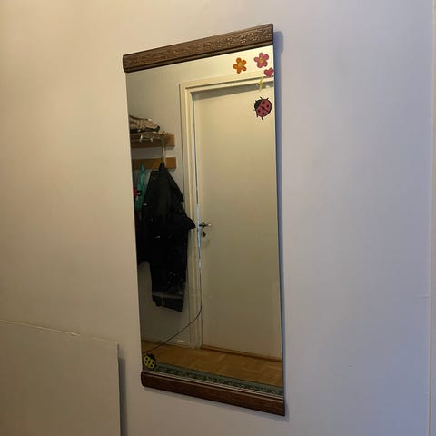 Rikkoutuneen peilin pala. Voi käyttää vaikka askarteluun (mosaiikki, taideopiskelijat) mutta toimii vielä ihan hätävarapeilinäkin. Peilin mitta 60cm.