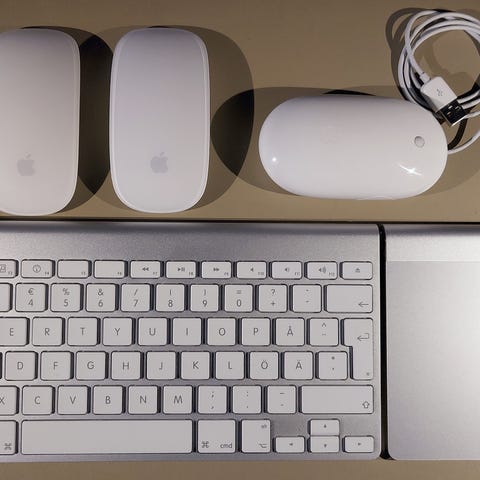 Myytävänä kasa aiemman sukupolven Apple syöttölaitteita (näppäimistö, hiiri, trackpad).