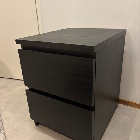 Hyväkuntoinen, valkoinen Ikean Malm yöpöytä kahdella laatikolla.