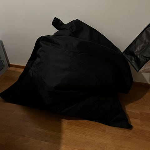 Punainen säkkituoli, jossa pieni reikä ja pieniä tahroja sivussa, ei haittaa käyttöä. Mitat eivät ole tarkat. Pitää tulla hakemaan.