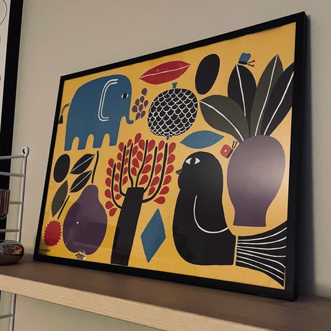 Marimekon juliste, koko 50x70 cm. Hyvässä ja siistissä kunnossa. Pinnassa hieman pientä aaltoilua ja parissa ruudussa pientä kulumaa, ks. kuvat. Muuten erinomaisessa kunnossa.