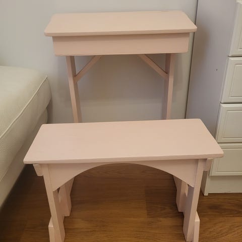 Hyväkuntoinen, laadukas ja jämäkkä pulpetti ja tuoli. Tukevaa puuta. Kannessa hieman käytön jälkiä. Leveys 78,5 cm, syvyys 50 cm, korkeus 64 cm.