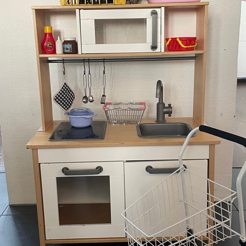 Leikkikeittiö ja muutamat leikkiruuat seuraavalle. Hyvässä kunnossa, taustapahvissa hieman käytönjälkeä.