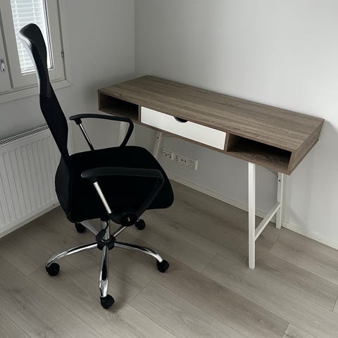 Työpöytä, jossa kuusi laatikkoa. Nyt purettuna odottamassa ostajaa (pöytälevy irtoaa laatikostoista). Alemmat laatikot hiukan jäykkiä ja laatikoiden avain hukkunut, muuten kunto hyvä käytetty. Vain nouto. Voidaan tarvittaessa auttaa kantamisessa.