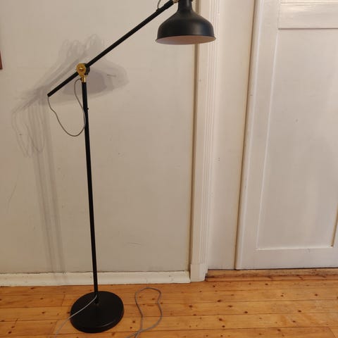 Hyvässä kunnossa oleva Ikean RANARP-lattiavalaisin. Yhteen nivelkohtaan laitettu korvaava ruuviosa, sillä alkuperäinen löystyi.