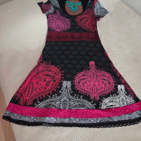 Musta kuviollinen Desigual mekko koossa L. Niukka koko.