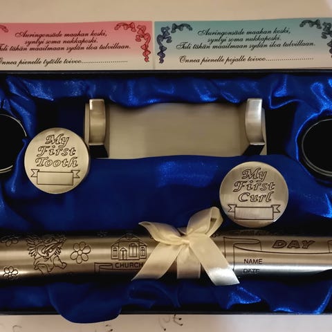 Myydään lahjaksi saatu käyttämätön ristiäislahja jossa kastetodistusputkilo ja tuki, sekä purkit ensihampaalle ja ensikiharalle. Mahdollista kaivertaa. Ovh 76e. Käy hyvin lahjaksi.