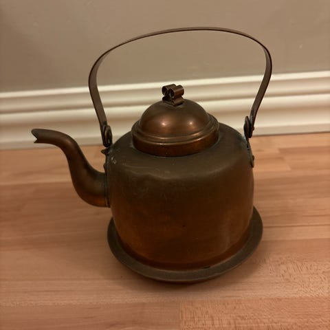 1970-luvulla huutokaupasta ostettu kuparinen kahvipannu puisella kädensijalla.