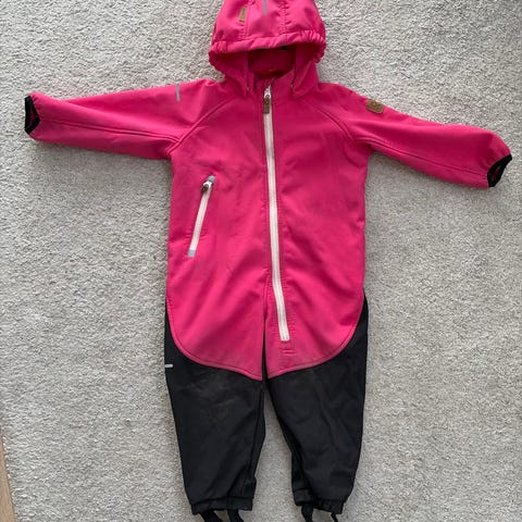 Kuvan mukainen softshell-haalari kokoa 86. Ainakin toinen jalkalenkki rispaantunut. Kahdella lapsella käytössä ollut, ihan käyttökelpoinen vielä. Ei reikiä tms. Vain nouto.