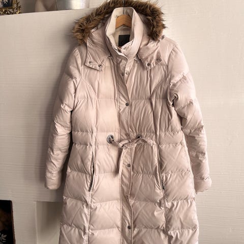 Väriltään upean viininpunainen, kerran pesty ja rumpukuivattu kokoaan vastaava aito untuvatakki. Malli on vartalon myötäinen. Kuvissa väri ei pääse oikeuksiinsa, luonnonvalossa kangas hohtaa kauniisti ja on kirkkaamman viininpunainen kuin näissä spottivaloissa kuvatuissa sisäkuvissa. Hihansuiden resorit ovat nyppyyntyneet. Hupun tekoturkis on irroitettava. Joitakin höyheniä/untuvia puskee ulos täytteestä.