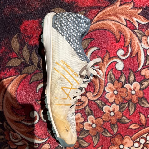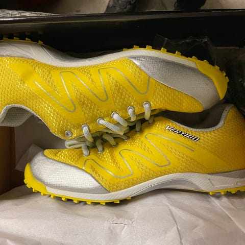 Käytetyt Karhu Vertigo pesispiikkarit. Koko UK6 (n.39). Pari piikkiä puuttuu. Kantapään ja pohjallisen välinen sauma irvistää, kanta kuitenkin tukevasti kiinni (kosmeettinen vika). Koiratalous.