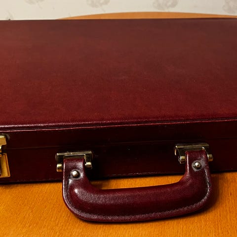 Nahkainen isoksi aukeava asiakirja salkku jonka kahvat saa upotettua piiloon. Kaksi osastoa vetoketjun takana ja lukittava sivutasku nepparilla.
