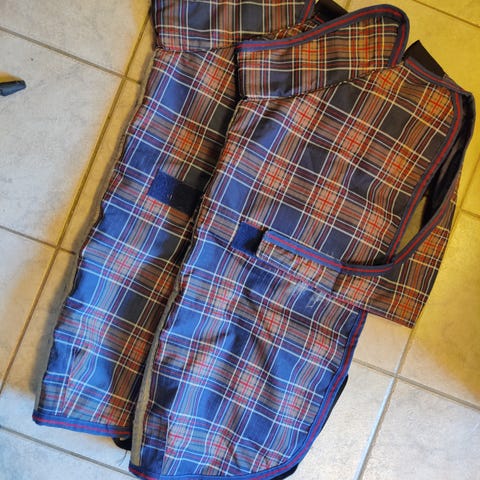Horseware Rambo koiran takki, jossa on punainen, keltainen ja musta väritys. Takki on valmistettu pehmeästä fleecestä ja siinä on tarrakiinnitys helppoa säätämistä varten edessä ja mahassa. Selkämitta n.43cm. Voin koittaa puhdistaa tarrat ennen myyntiä. Käytetty enimmäkseen suihkun jälkeisessä kuivattamisessa manchesterinterrierillä