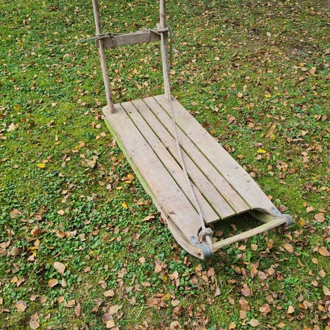 Täysin entisöity. Vahva kestävä kelkka, metalli jalaksilla. Voi työntää, tai vetää. Koko pituus 140 cm. Lavan pituus 105 cm. Lavan leveys 50 cm sisältä.