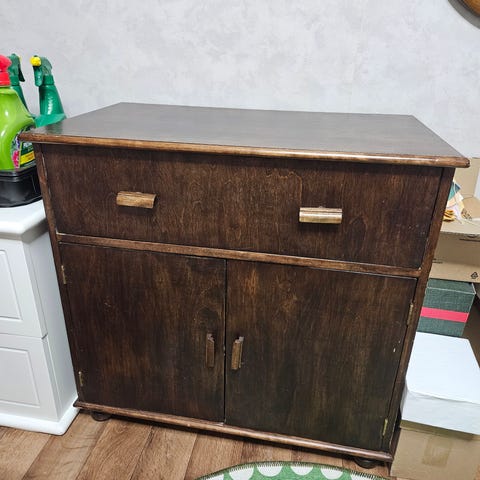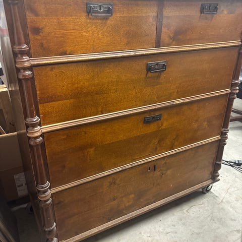 Antiikkityylinen puinen lipasto, jossa on koristeelliset metallivedimet. Lipastossa on kaksi isoa isoa laatikkoa