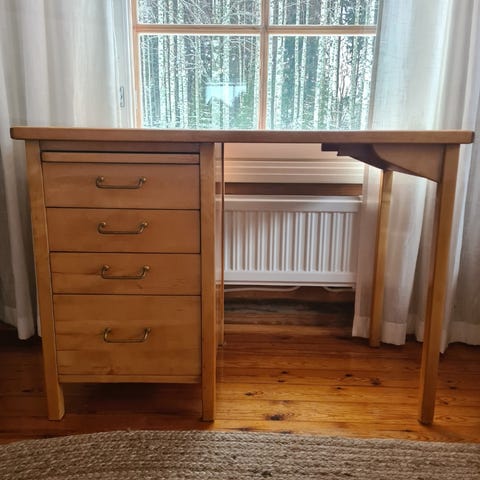 Tummanruskea, patinoitunut, antiikkinen työpöytä/sivupöytä kauniilla yksityiskohdilla. Pöytä "notkuu" sivusuunnassa, vaatinee korjausta jos työpöytäkäyttöön haluaa. Saa myös tarjota!