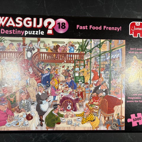 Jumbo Wasgij 36 New Year Resolutions! Original Puzzle, 1000 palan palapeli. Älä tee mitä kuvassa näkyy vaan mitä nainen näkee edessään. Laatikossa jotain kulumaa, palat priimat ja kaikki tallessa.