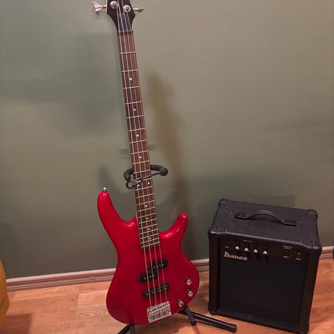 Myydään hyvässä kunnossa oleva bassosetti, sisältäen basson, vahvistimen ja telineen. Bassokitaran rungossa muutama kosmeettinen jälki, muuten ei moitittavaa.