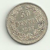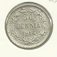 Suomi 50 Penniä 1914 hopearaha, jossa on vuoden 1914 vuosiluku ja koristeellinen lehtikuvio. Rahassa on Suomen vaakuna ja koristeellinen kruunattu kotka. Sopii keräilyyn tai numismaattiseen käyttöön. Leimakiiltoinen hinta 3 e posti 2.50 e