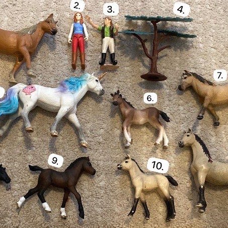 Myydään Schleichin hevosfiguureja yhteensä 5 kappaletta. Mukana 3 aikuista hevosta ja 2 varsaa. Figuurit ovat uudenveroisia, siistejä ja ehjiä, ei kulumia. Ei ole leikitty ulkona eikä sisällä. On ollut hyllyllä koskenattomina.Myydään ilman alkuperäisiä hintalappuja. Sopii hyvin leikkeihin tai keräilyyn 🐎
