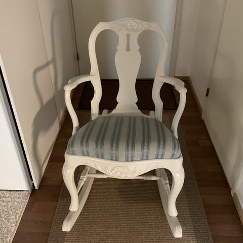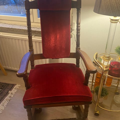 Laadukas ja siistissä kunnossa oleva suomalainen keinutuoli ja jalkarahi. Valmistaja Urjalan keinukaluste Seppo Saari, Karoliina-tuoli. Pehmusteiden kangas ja käsinojien päissä hieman kulumaa.