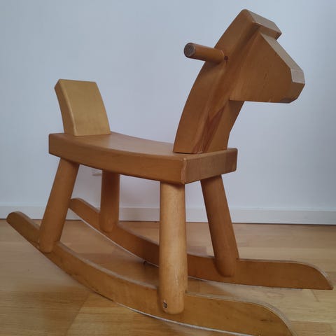 Punainen Juho Jussilan keinuhevonen. Puinen. Klassikko lelu taaperoille ja alle kouluikäisille, noin 2-6v.