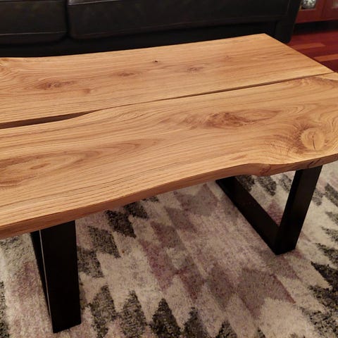 Kookas ja varsin näyttävä sohvapöytä. Pinnoitteena 2x väritön puuvaha (ei lankkujen alapinnassa). Uudet metallijalat. Lankut ovat noin 35 mm paksut "peilikuvat". Kannen leveys päissä on noin 68/79 cm. Pitemmillä jaloilla tämä voisi olla ehkä ruokapöytäkin.