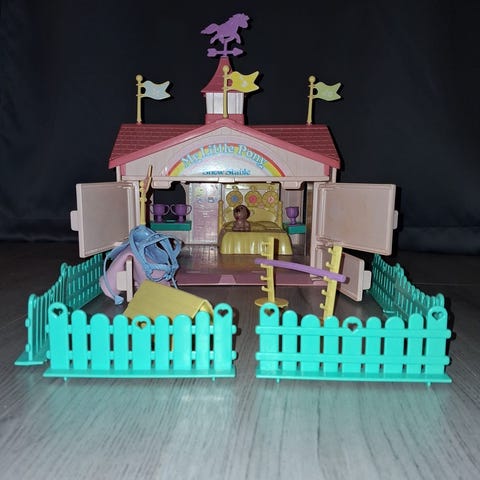 Myydään hyväkuntoinen My Little Pony Show Stable- talli. Hintaan sisältyy myös kuvan varusteet: koira, sänky, kakku, aitoja, estepidike, porkkana, 4 lippua, palkinto, 2 ikkunatasoa, porkkana, este ja torni tallin katolle.