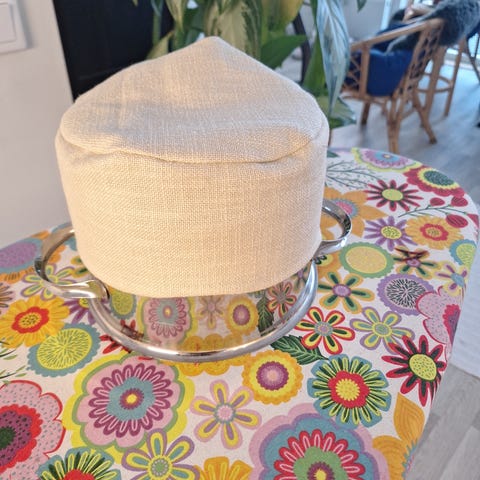 Hattens mått: inre omkrets 56 cm, hatten från en sida till den andra 40 cm, från framkant till bakre kant 40 cm.