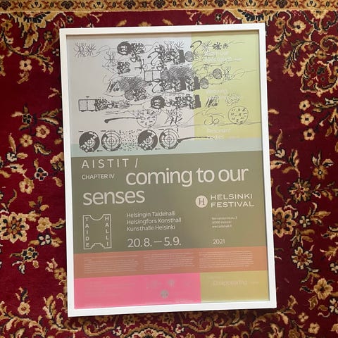 Taidejulisteet, abstraktit kuviot kehystettyinä.