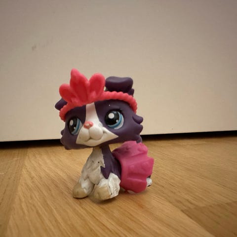 Littlest Pet Shop koira figuuri, jossa on ruskea väri ja musta rusetti. Pieni koko, sopii keräilyyn tai leikkeihin.