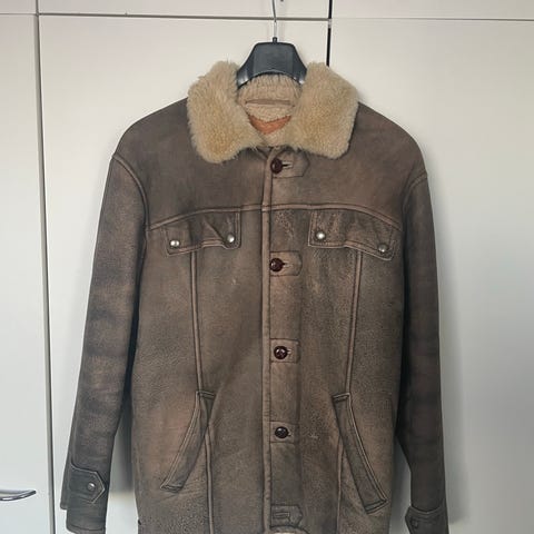 Ruskea vintage lentäjäntakki aitoa nahkaa ja lampaanvillaa. Merkki Hollies, koko miesten L. Upean kuluneen vintage-lookin miinuspuolena valitettavasti takkia on edellisessä elämässään säilytetty niin, että nahka on päässyt pahasti kuivahtamaan - ei sentään kovaksi, mutta se ei ole enää tehdystä rasvauksesta huolimatta vahvimmassa kunnossa, minkä vuoksi toinen kyynärpää revennyt (ks. viimeinen kuva). Villaa myös irtoaa hennosti esim. mustiin vaatteisiin tehdystä harjauksesta huolimatta, vaikka muutoin villa hyvässä ja pitävässä kunnossa.