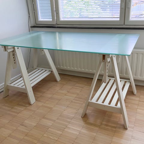 Myydään muuton alta pöytä joka koostuu isosta lasilevystä ja kahdesta metallisesta pöytäjalustasta. Lasilevyn alapuolella on maalinjälkiä sillä pöytä ollut ateljeessa käytössä. Maalitahrat voi mahdollisesti saada esim taikasienellä tai pesuaineella pois, mutta myydään sellaisenaan.