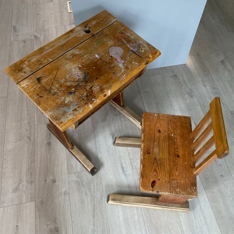 Lasten pulpetti. Maalaamalla saa vielä hyvä. Pulpetissa sisäpuolella tarroja. Ulkopuolella tarra ja muutamassa kohtaa kirjoitusta.