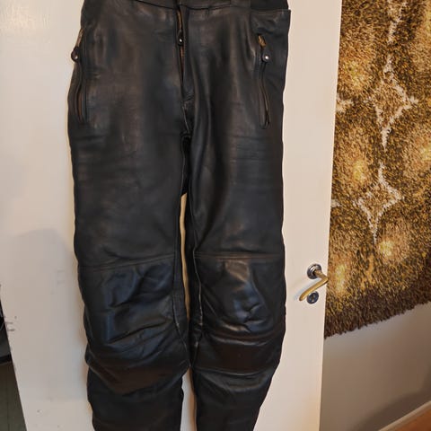 Nahkainen moottoripyöräasu, koko 52 mutta sopii hyvin noin 175cm kokoiselle ihmiselle.